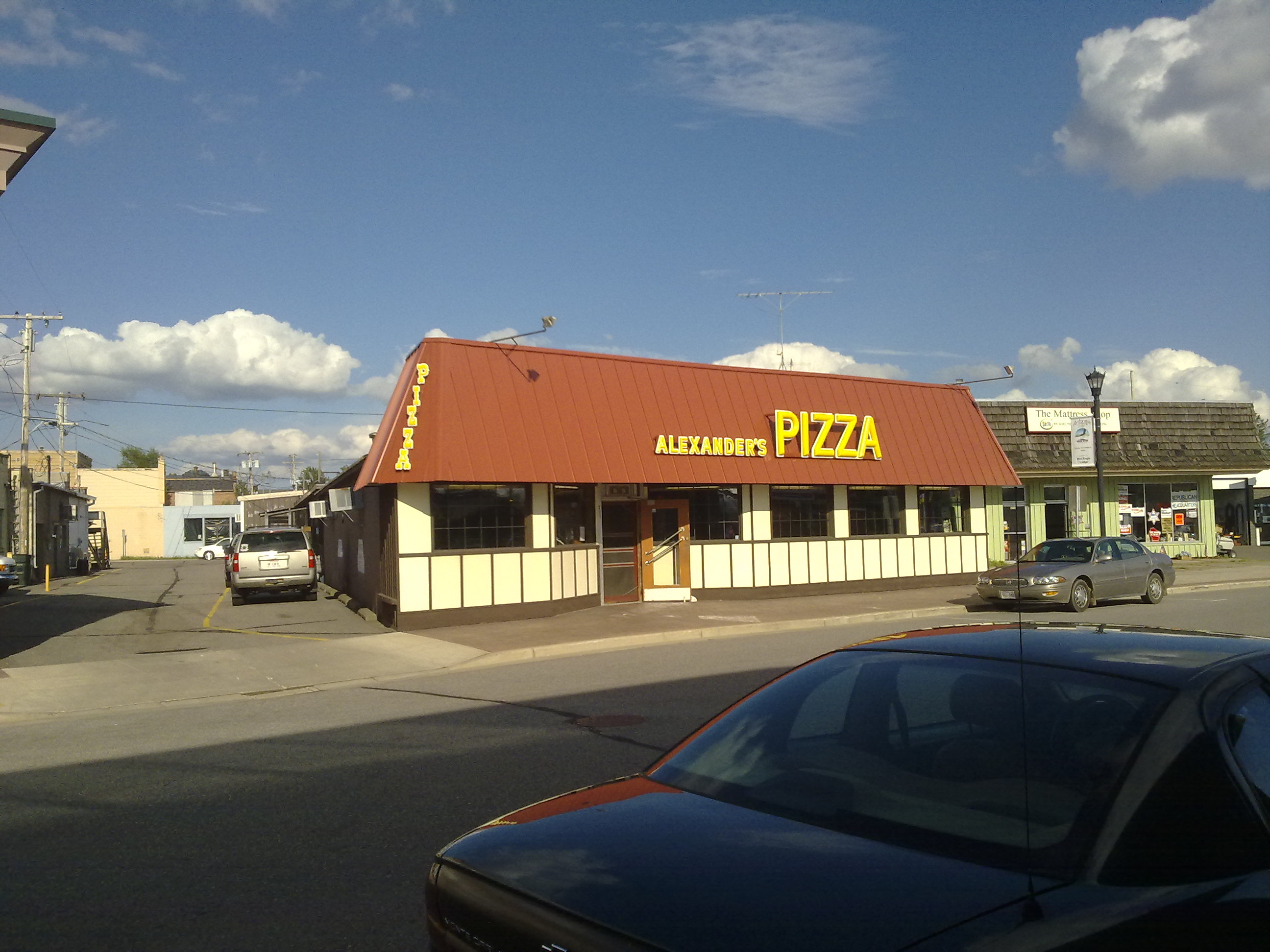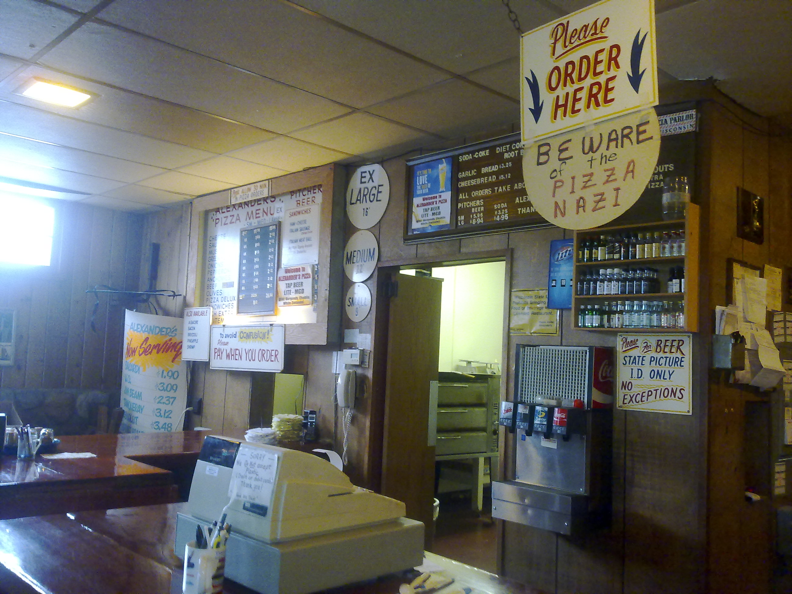 Hoy un poco sobre donde trabajo. Dicen que la mejor pizza de la area se encuentra en Alexanders, donde yo trabajo. El local lleva ya más de 30 años abierto, elaborando una receta única para la masa y con unos ingredientes bastante buenos... supongo que no debería decir nada más. Bueno, en todos estos años han pasado por aqui personas bastante famosasa como Harrisson Ford o Sandra Bullock, además de un montón de jugadores de equipos de basket, hockey, futbol... que yo no conozco.Hay una anécdota buena. Hay un capítulo de Seinfeild (un clásico de los 90, que gran serie) que se llama the Nazi soup, yo no lo he visto pero va de una tienda donde sirven sopas en nueva york. Resulta que el dueño es un auténtico nazi, no se porta muy bien con sus clientes pero su sopa es tan buena que a pesar de ello la gente no deja de ir. El escritor de este capítulo vino un dia a la pizzeria y conocío a mi jefe. Mi jefe también es un nazi, deberias verlo hablando con los clientes. Tras hablar un poco con él, el guionista de seinfeld le dijo que si le hubiera conocido antes, el capítulo se habria llamado the nazi pizza. Desde entonces el jefe ha colgado un cartel que pone "Beware of the pizza nazi" donde atiende, refiriéndose a él. Y es bastante nazi.