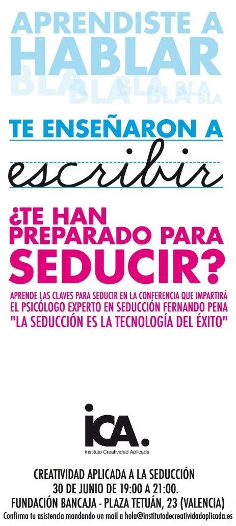 El próximo jueves 30 de junio se realiza una presentación del taller de creatividad aplicada a la seducción, un taller al que probablemente, si estás en Valencia, deberías ir. Será una conferencia en el que se darán algunas claves para seducir con éxito. Además es uno de los primeros eventos que realiza en Instituto de Creativida Aplicada, con lo cual también servirá para presentarlo. Por cierto hay plazas limitadas asi que mejor no esperar al último momento para enviar el correo
